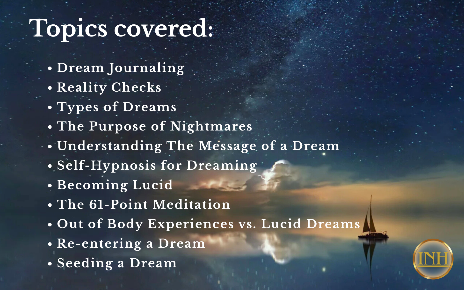 In this group hypnotherapy workshop, you will learn to utilize the powerful cross-section between hypnosis and dreaming to develop and accelerate your ability to explore your inner world every night.
